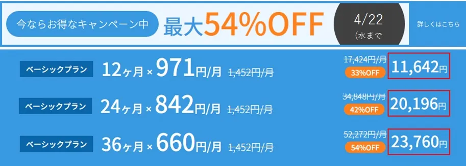 以下では、現在のキャンペーン+お友達紹介を適用した「実際のお支払い料金」を記載しています。